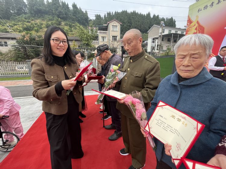 活动伊始,在热烈的掌声中,各位领导为27位“最美老人颁发了荣誉证书和鲜花,表彰他们用一生的品格为后辈树立了榜样,用乐观从容的心态温暖着整个大家庭。接着,领导们为老人们分发了寓意“步步高升、健康长寿”的重阳糕。一块块香甜的糕点,承载着深深的祝福,愿每一位长者岁岁常欢愉,年年皆安康。