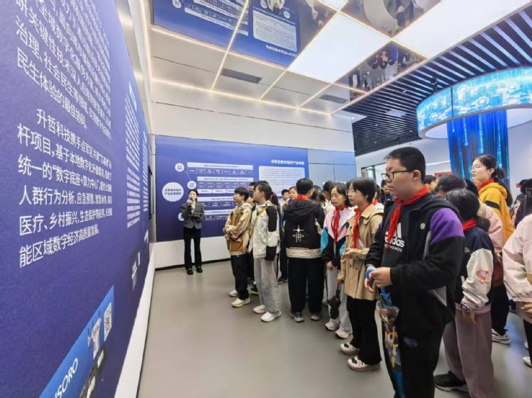在随后的参观环节中,园区讲解员引领学生们步入科技创新的前沿天地。从网信产业的宏观布局到人工智能的日常应用,从数字车间的智能制造到创新创业的生态构建,同学们在沉浸式体验中不断发出惊叹与提问: