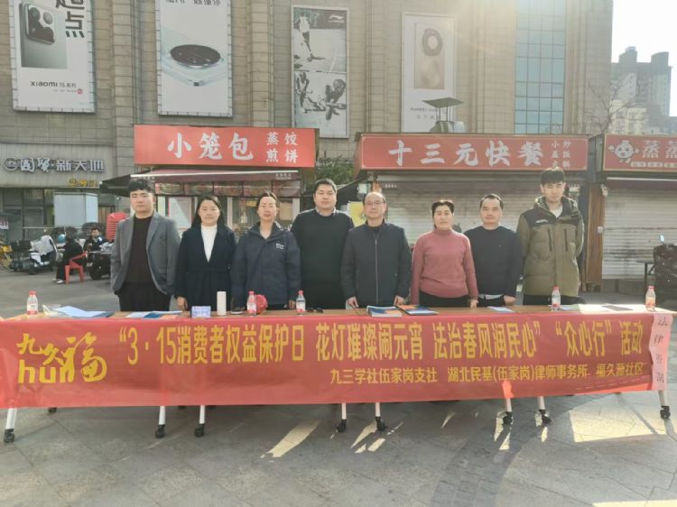 元宵喜乐闹佳节,法治护航暖民心。在“3·15消费者权益保护日”来临之际,恰逢元宵佳节,为传承传统民俗文化、普及消费维权知识,切实提升社区居民的幸福感与安全感,2026年3月3日,九三学社伍家岗支社联合湖北民基(伍家岗)律师事务所、福久源社区居委会、社区物业等多方力量,在福久源社区开展“九久hui福”法律咨询与宣传“众心行”暨“花灯映巾帼 喜乐庆双节”元宵游园系列活动,以多元形式为社区居民送上一份兼具法治温度与节日暖意的“双节厚礼”。